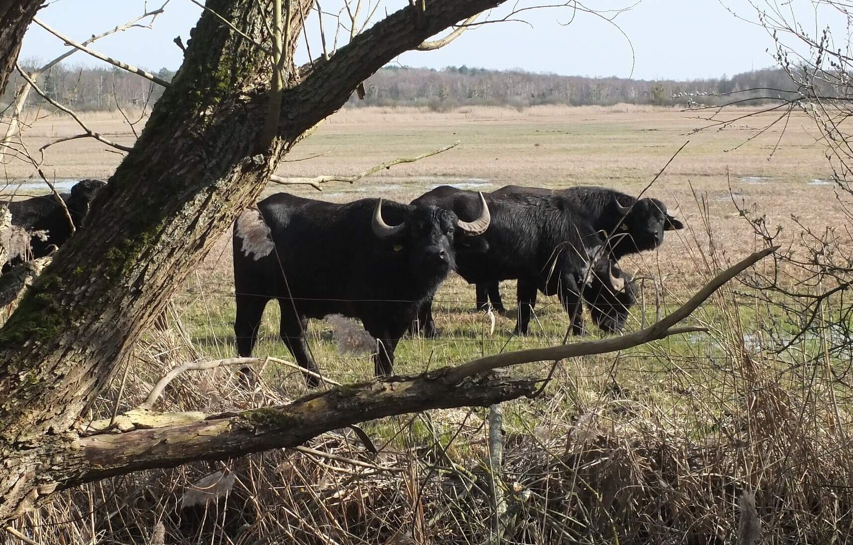 Die Wasserbüffel sind besonders gut an feuchte Flächen angepasst. Sie sinken nicht zu tief in den nassen Boden ein und fressen die Flächen schonend ab. Die Büffel verspeisen Schilf und Galloways auch das frisch aufgewachsene harte Landreitgras, was andere Tiere stehen lassen. Ihre Trittspuren, Pfade, Suhlen und Sandbadestellen erweitern das Mosaik von Lebensräumen für viele, oft bedrohte Pflanzen- und Tierarten. An besonders feuchten Stellen hinterlassen die robusten Tiere nasse Pfade, auf denen zum Beispiel Amphibien wandern und sich ausbreiten können. Oder Schmetterlinge stärken sich in der Frühlingssonne an einem wassergefüllten Klauenabdruck.
