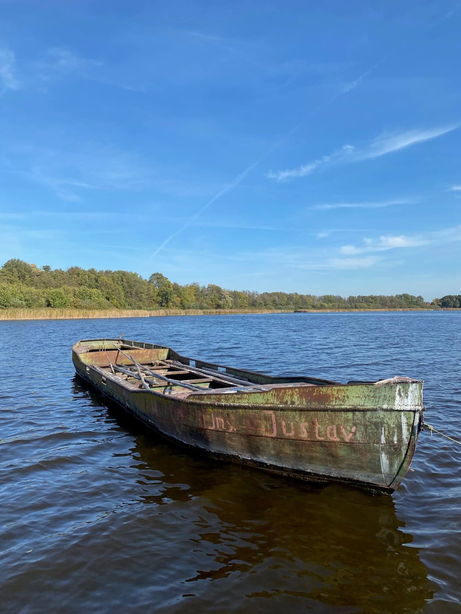 Der ehemalige Zugnetzkahn gehört der Fischerei Köllnitz in Groß Schauen bei Storkow. Die Fischerei hat sich der nachhaltigen Fischwirtschaft verschrieben. Sie nutzt den Kahn in den wärmeren Monaten nicht. Er liegt wie eine kleine Insel vertäut auf dem See. Dort können die Vögel ungefährdet brüten.