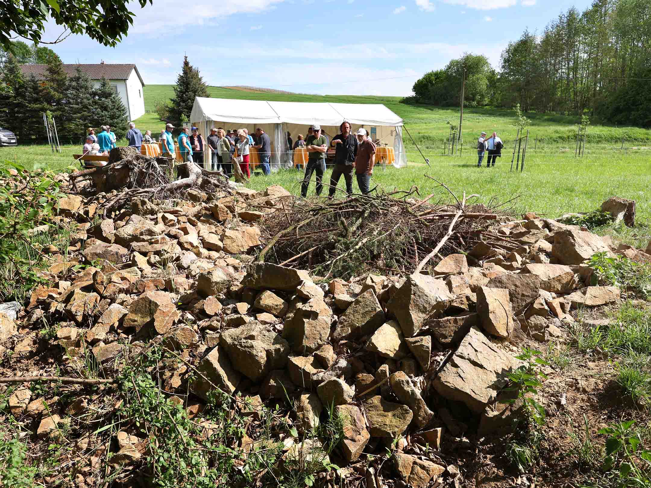 Neben der Weide wurde eine Streuobstwiese auf der offenen Fläche angelegt. Die rund 60 neu gepflanzten Bäume hat der Lebensmittel-Discounter Lidl gesponsert. Hans-Jürgen Buchner, Kopf der Band Haindling, unterstützt das Projekt in seinem Heimatort als Schirmherr und krönte den heutigen Festakt mit einem musikalischen Live-Auftritt.
