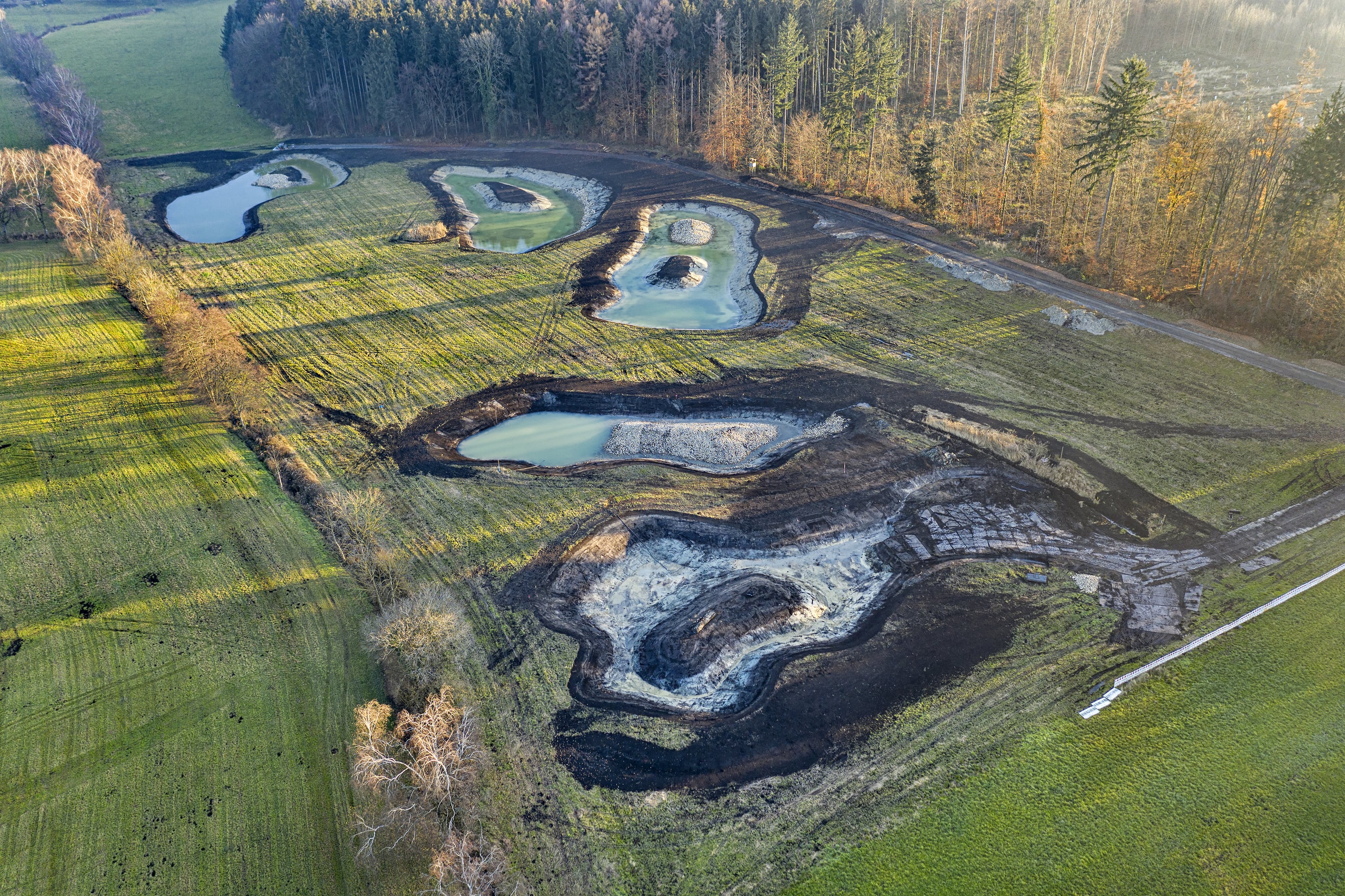 Die Bagger sind abgerückt, die Weiher füllen sich langsam mit Wasser. Rechtzeitig zum Frühjahr finden Amphibien hier neue Laichgewässer. Auch für eine Vielzahl weiterer Arten wird das neue Biotop Lebensraum bieten. Bis vor Kurzem war die Fläche ein intensiv bewirtschafteter Maisacker und für die biologische Vielfalt wertlos. Der Boden, ein ehemaliges Niedermoor, wurde für die landwirtschaftliche Nutzung stark entwässert. Dadurch wurde klimawirksames Kohlenstoffdioxid in die Atmosphäre freigesetzt. Durch die Anlage der Weiher und die Umwandlung von Acker in extensives Feuchtgrünland wird die Entwässerung und die CO2-Freisetzung gestoppt. Zum Schutz der biologischen Vielfalt ist der Standort außerdem ein wichtiger Trittstein zwischen dem bestehenden Heinz-Sielmann-Weiher in Billafingen und dem Heinz-Sielmann-Weiher in Frickingen am Aubach.