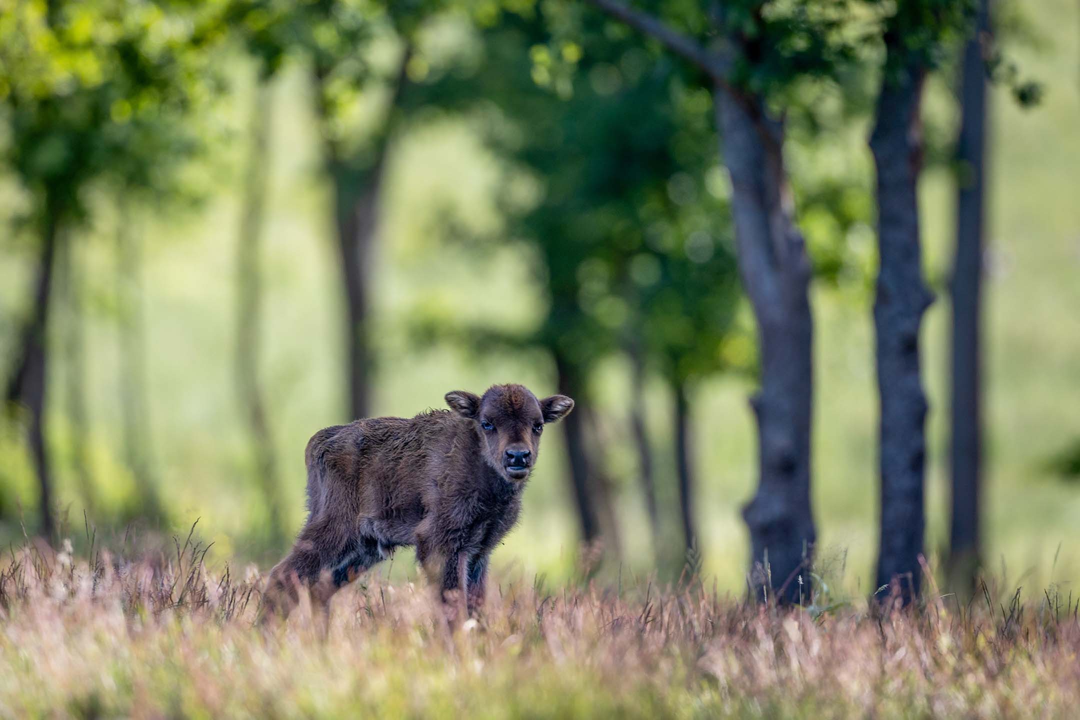 Im Juni ist Kälberzeit bei den Wisenten. Die Mutterkuhherden ziehen sich dann mehrheitlich in weniger offene Bereiche der Kernzone zurück. Für die Geburt sondert sich das Muttertier von der Herde ab und bringt ihr Kalb allein zur Welt.