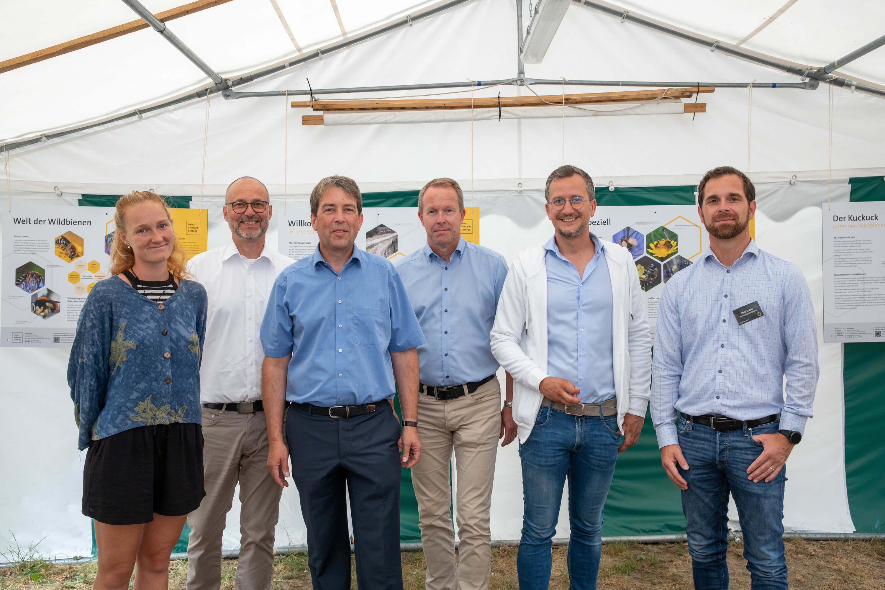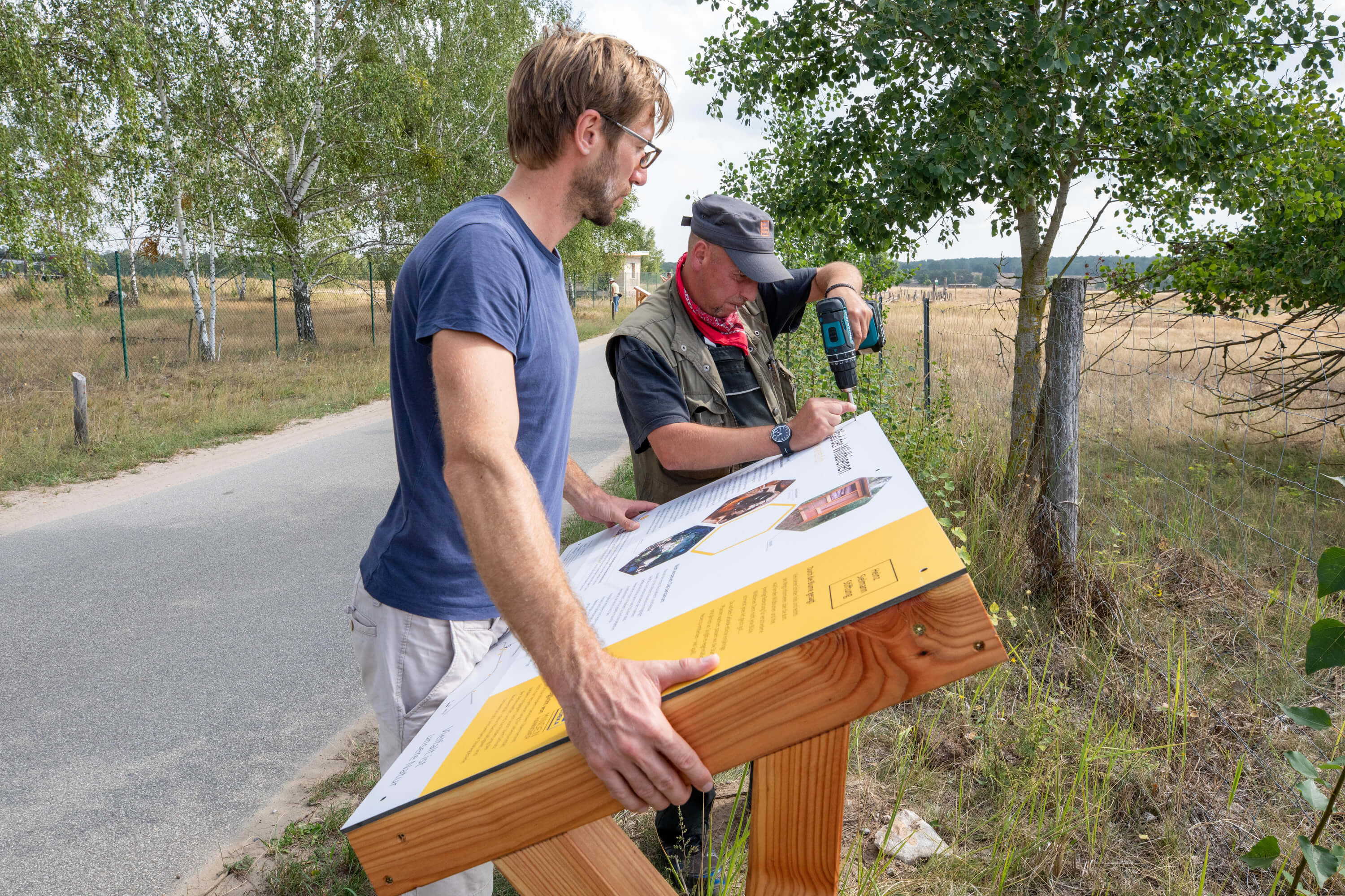 Nach der heutigen Präsentation werden die Tafeln im Gelände der Sielmanns Naturlandschaft Döberitzer Heide aufgestellt. Die erste Tafel steht am Wanderweg vor dem zukünftigen Naturschutzerlebniszentrum in Elstal. Die fünf weiteren Tafeln begleiten die Besucher:innen für die nächsten gut 500 Meter in das große Naturschutzgebiet mit interessanten Details zu den nützlichen, aber auch bedrohten Insekten. Ihre Lebensräume, Nahrungspflanzen und ihre immense Bedeutung für das Ökosystem werden auf den Tafeln beschrieben, unterstützt von aussagekräftigen Fotos. Darüber hinaus gibt es am Wegesrand Nisthilfen für Wildbienen und ein so genanntes „Sandarium“. Beide zeigen exemplarisch, wie man den eigenen Garten wildbienenfreundlich gestalten kann.