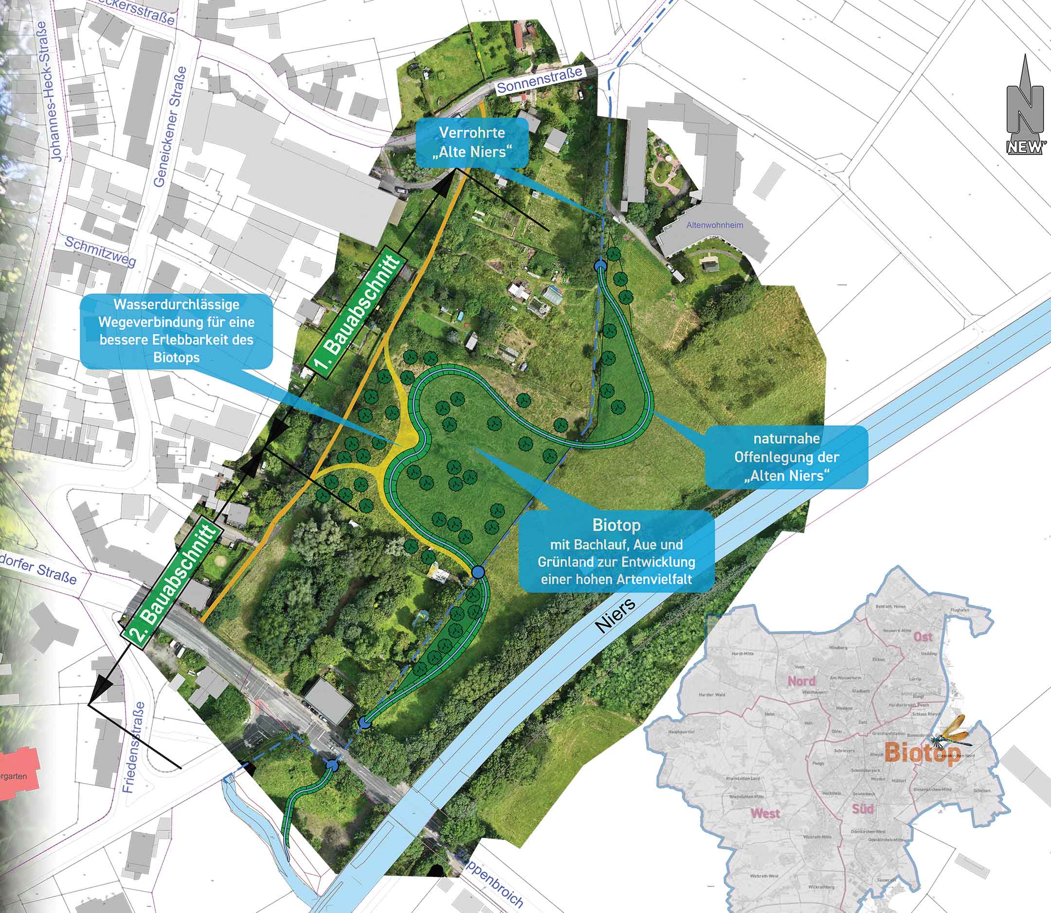 Felix Heinrichs, Oberbürgermeister der Stadt Mönchengladbach, erklärt hierzu: „Mit der naturnahen Gestaltung der Alten Niers nördlich der Zoppenbroicher Straße schaffen wir ein wertvolles Biotop mitten in der Stadt – und setzen gleichzeitig einem berühmten Sohn unserer Stadt, Heinz Sielmann, ein würdiges Denkmal. Das neue Biotop wird Lebensraum für viele verschiedene Arten werden, aber auch ein Ort der Naherholung für unsere Bürgerinnen und Bürger. Wir schließen damit inhaltlich und räumlich an die erfolgreiche Renaturierung der Niers im Bresgespark durch den Niersverband an. Ich freue mich sehr über diese Kooperation zwischen der Stadt, der NEW und der Heinz Sielmann Stiftung.