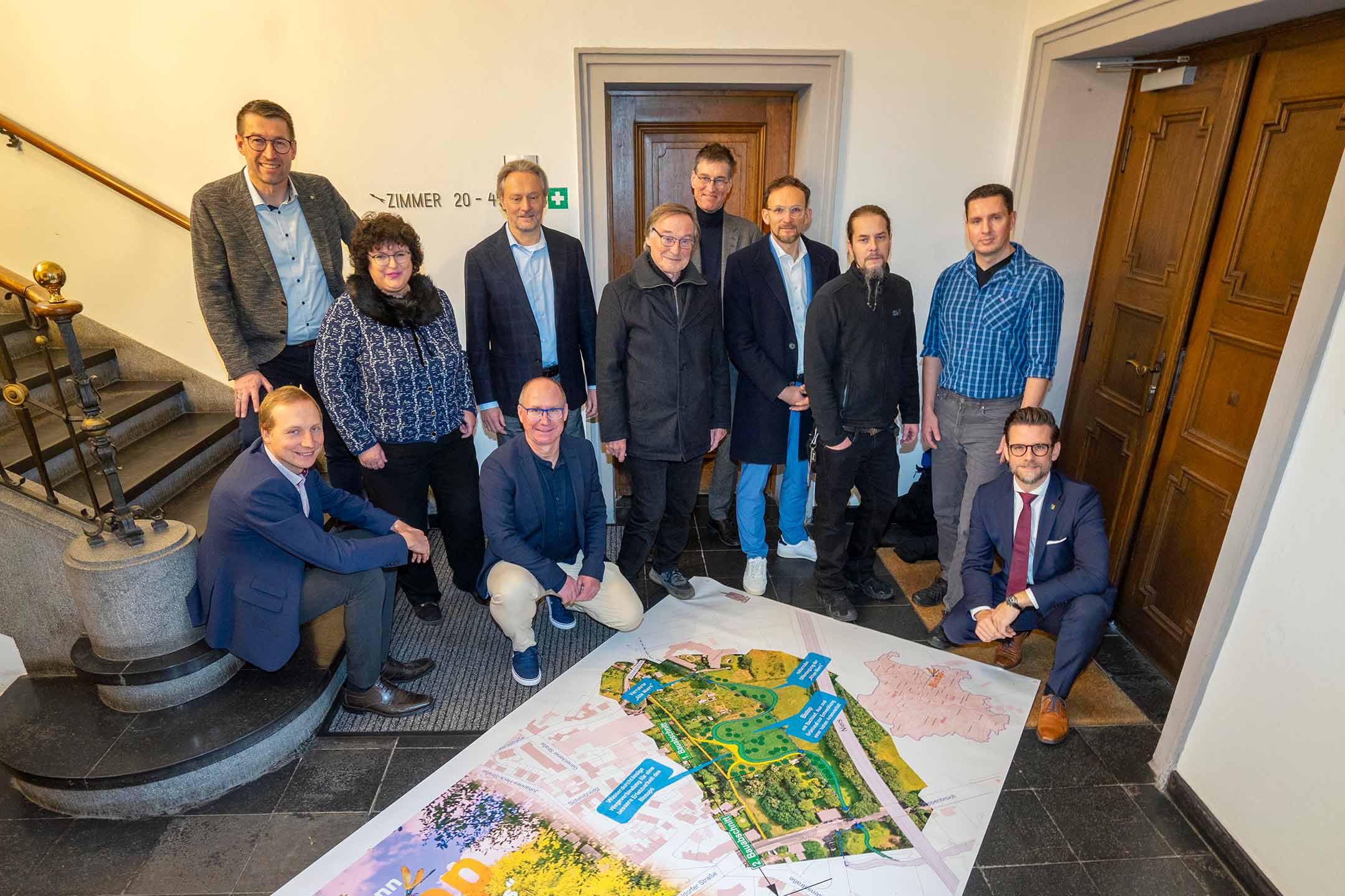 Bei der Projektvorstellung im Rathaus von Mönchengladbach präsentierte Oberbürgermeister Felix Heinrichs heute gemeinsam mit den Projektpartnern den aktuellen Planentwurf. Ziel des Projekts ist es, den bislang durch einen verrohrten Regenkanal geleiteten Bach in Rheydt im Stadtteil Bonnenbroich-Geneicken zwischen der Zoppenbroicher Straße und dem Seniorenheim an der Sonnenstraße wieder in einen naturnah gestalteten, oberirdischen Lauf zu betten.