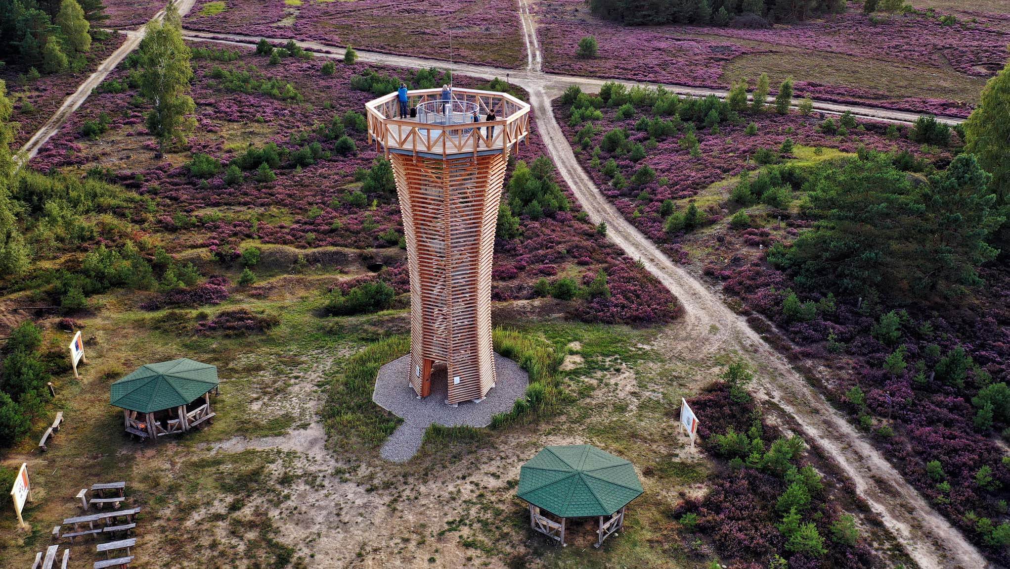Auf dem Sielmann-Hügel begrüßen der Landrat des Landkreises Ostprignitz-Ruppin, Ralf Reinhardt, sowie Vertreter:innen der Heinz Sielmann Stiftung, des Naturparks Stechlin-Ruppiner Land und des Tourismusverbands Ruppiner Seenland die Gäste. Regionale Spezialitäten stehen zur Bewirtung bereit. Der 15 Meter hohe, hölzerne Aussichtsturm auf dem Sielmann-Hügel ist für den Aufstieg geöffnet und ermöglicht weite Rundumblicke in die abwechslungsreiche Heidelandschaft.