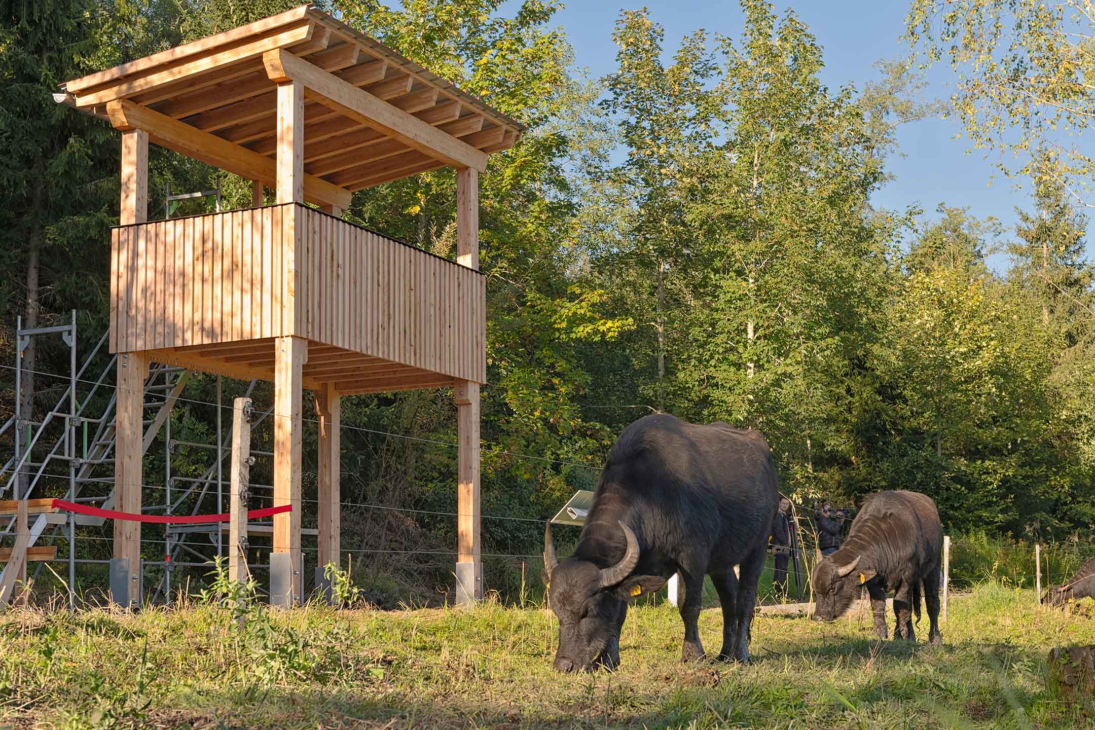 Künftig kann die Moosmühle von oben betrachtet werden: Die neue Beobachtungsplattform steht Besuchern ab heute ganzjährig offen. Sie befindet sich in der Nähe des Waldfriedhofs, direkt am Weg, der entlang des Weidezauns führt. Bei der festlichen Einweihung stellten die Verantwortlichen der Heinz Sielmann Stiftung und der Stadt Leutkirch das Projekt vor.
